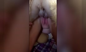 Hosrse cock in her pussy while her hand do anal fisting