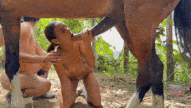 Around seven minutes into the scene, the two girls simultaneously pleasure the horse's hard member, sucking the head and licking the shaft causing the cock to flare profoundly.